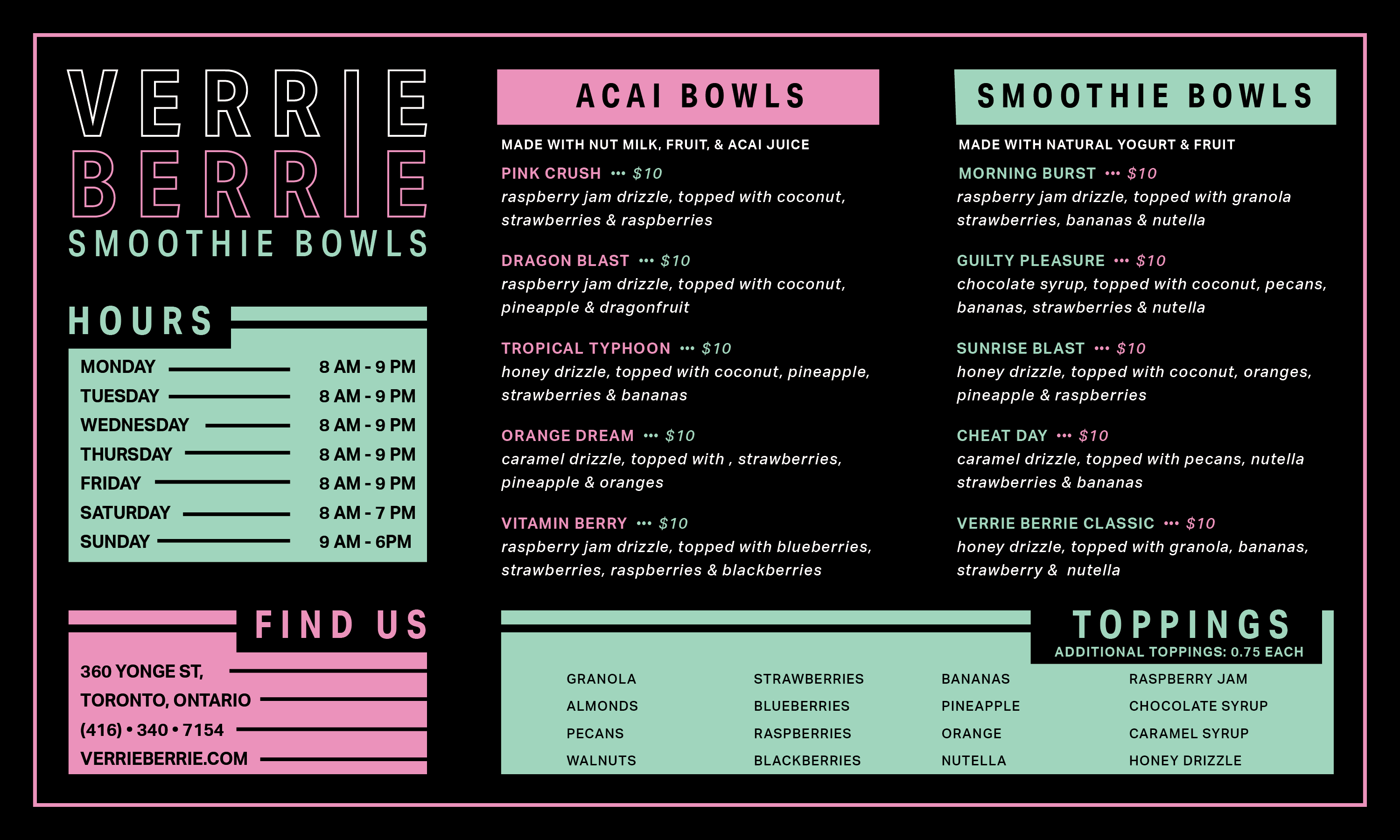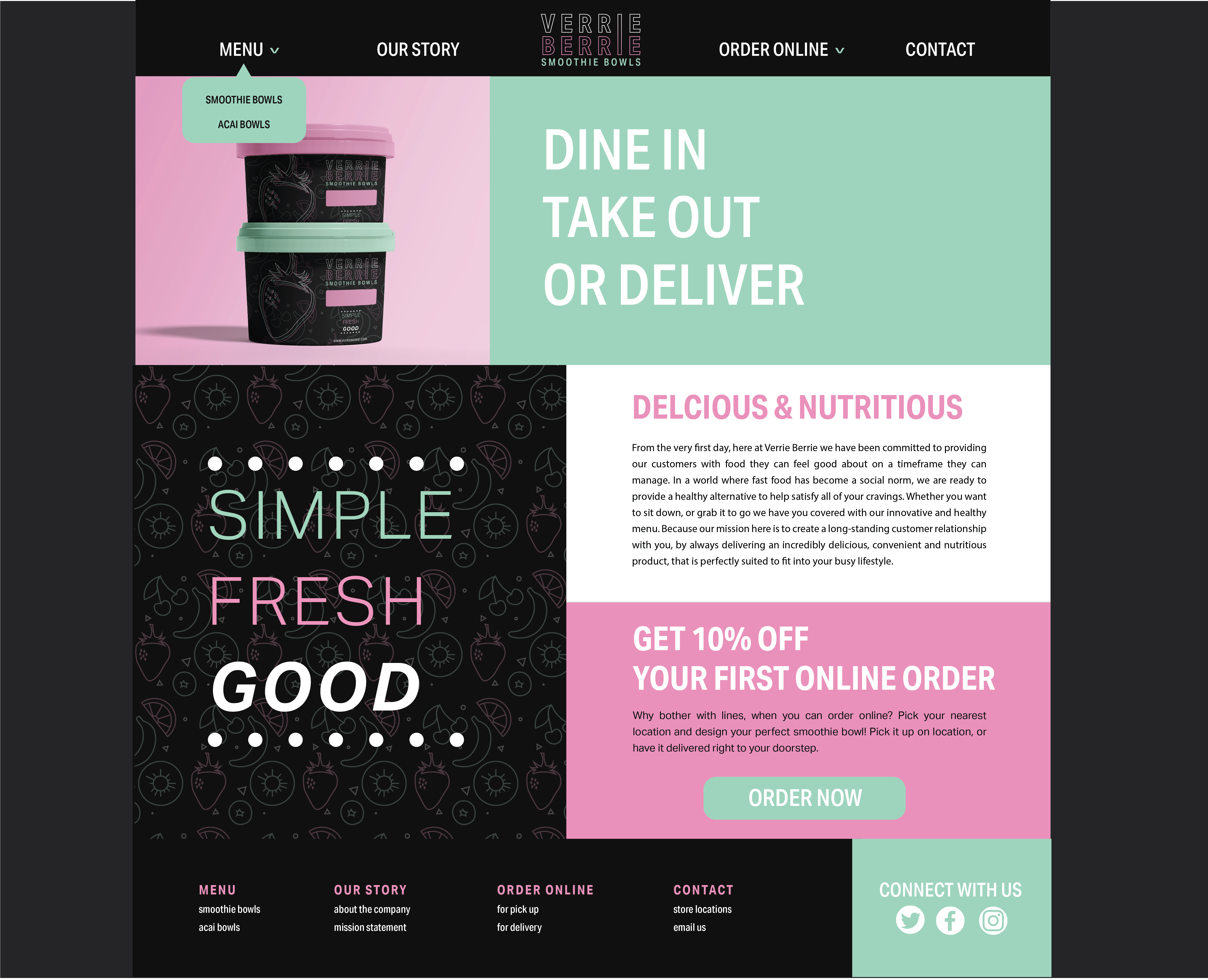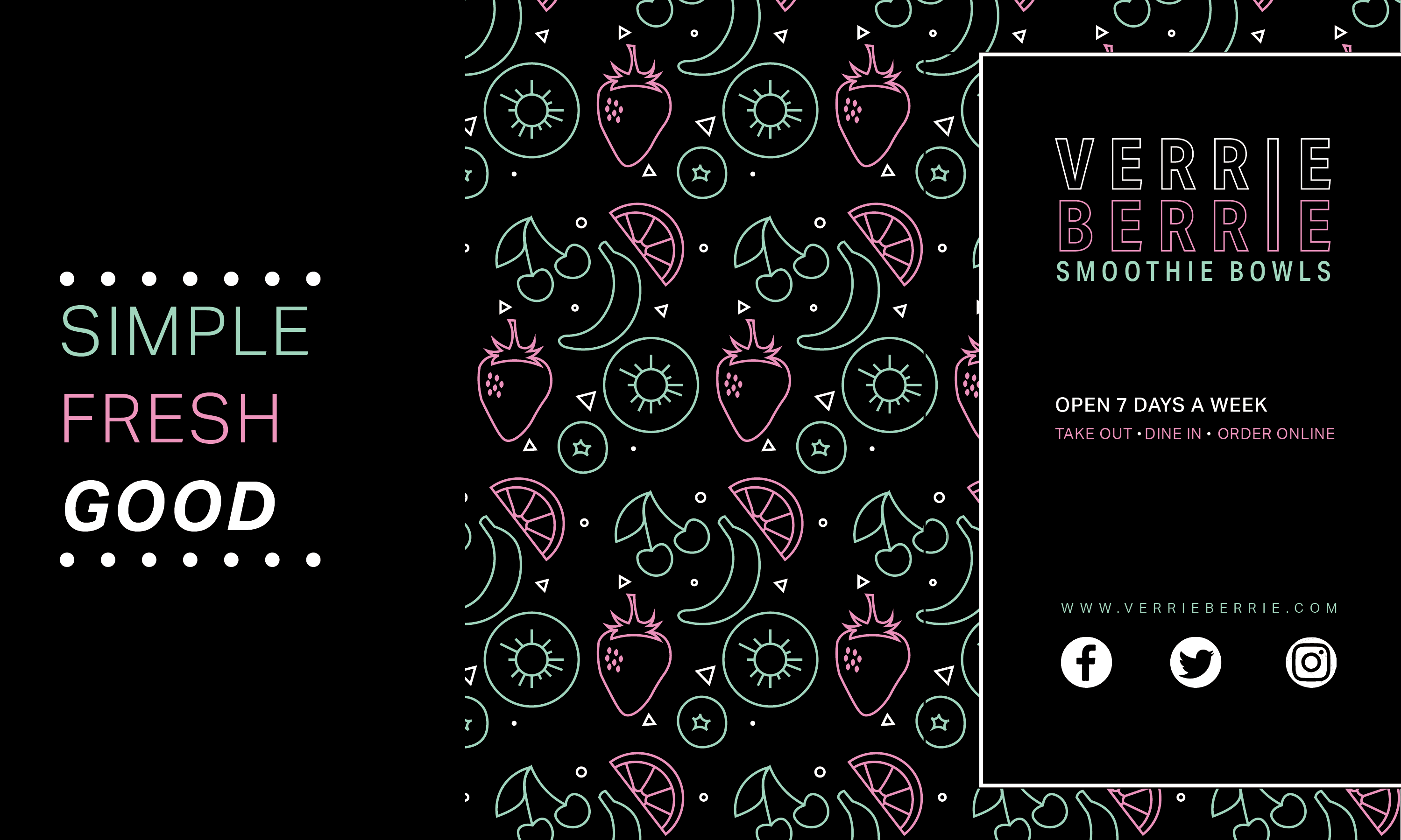 Using contrasting colourso n a dark background, this project was designed to stand out against the typical approach to a smoothie company. It features a business cards and a trifold menu.