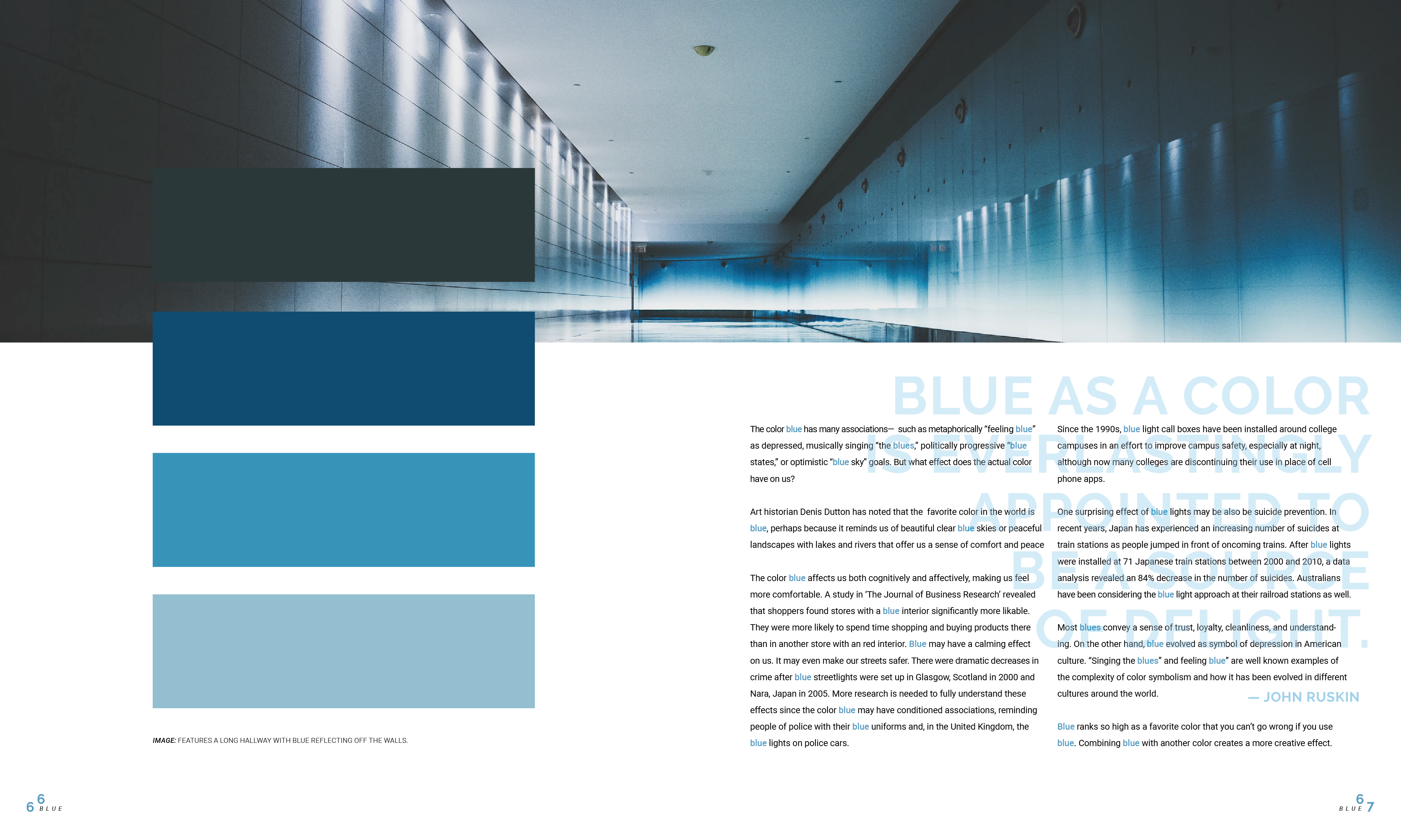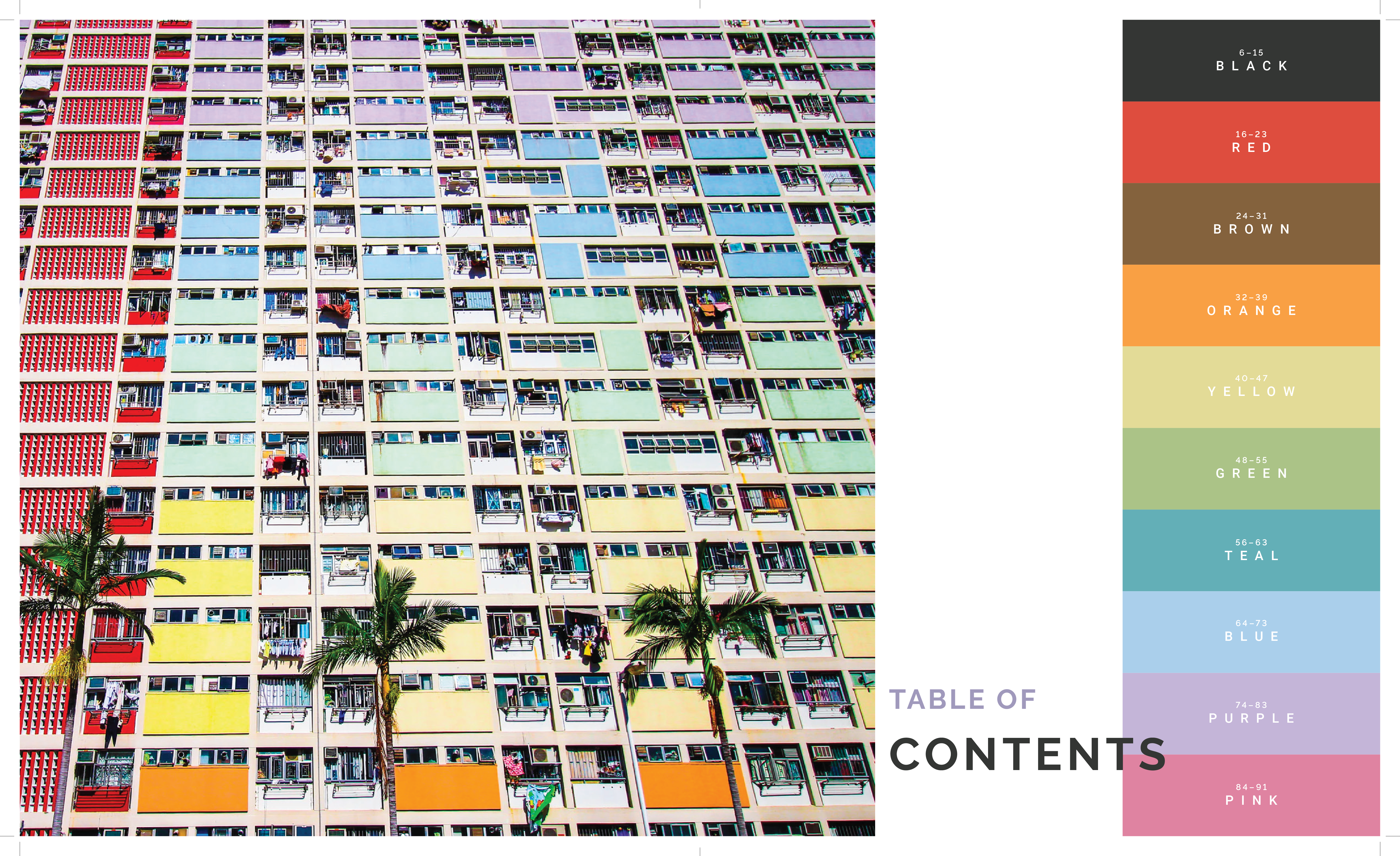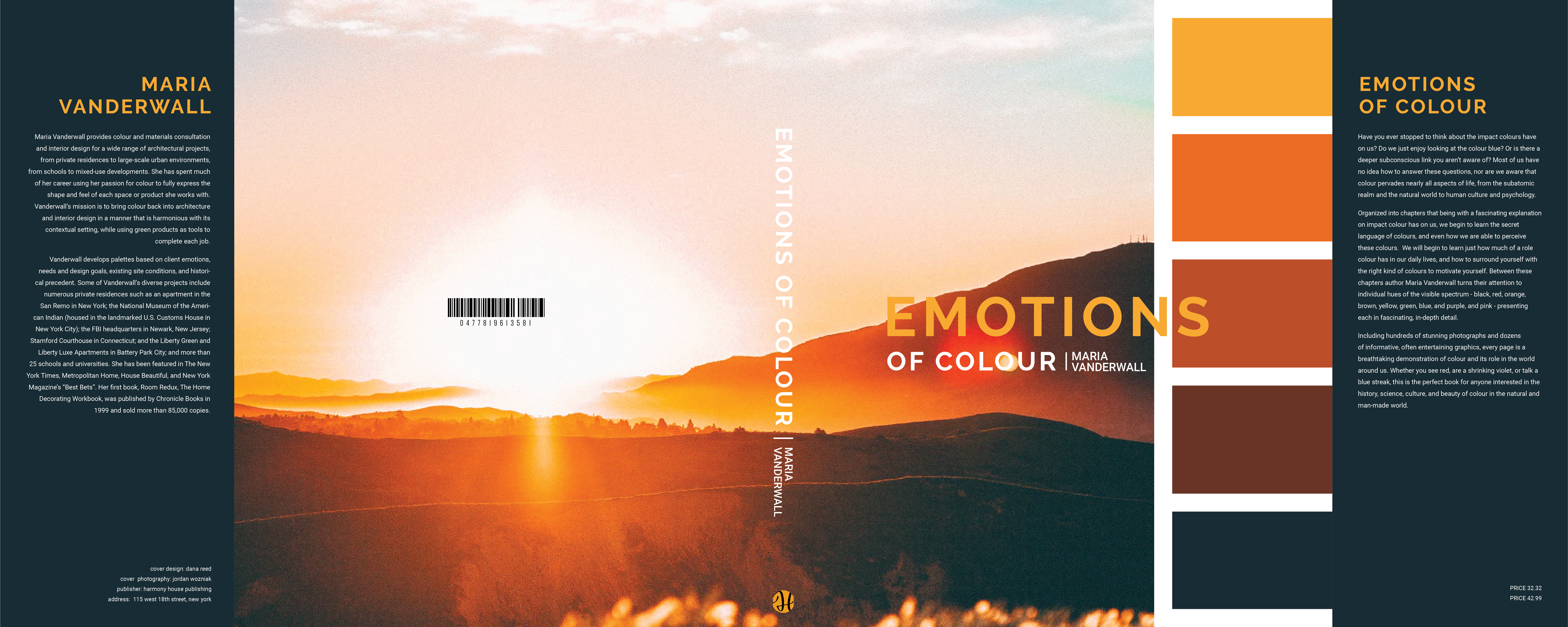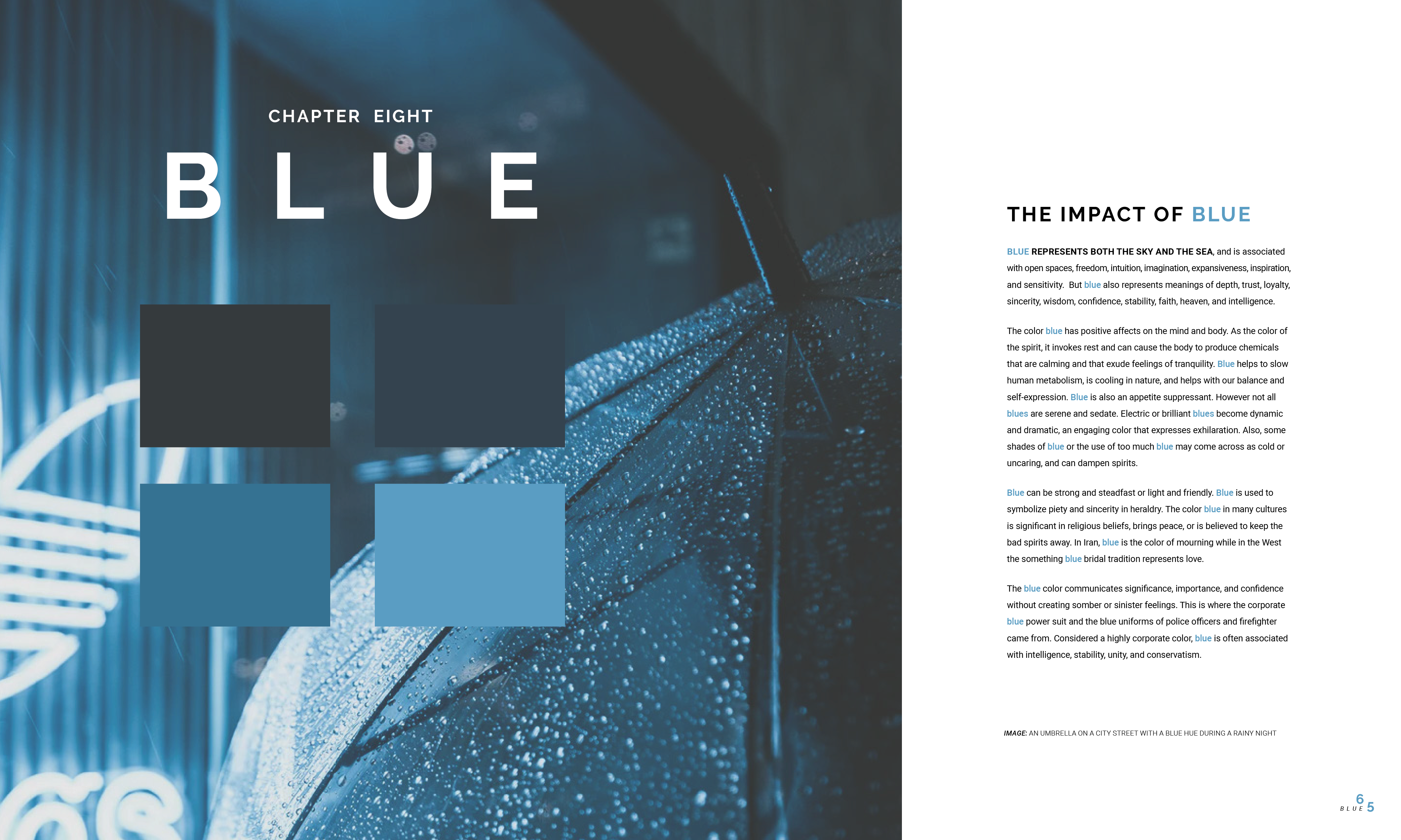 The outside cover, page of contents, and inside spreads of a coffe-table book based around the emotions of colour.